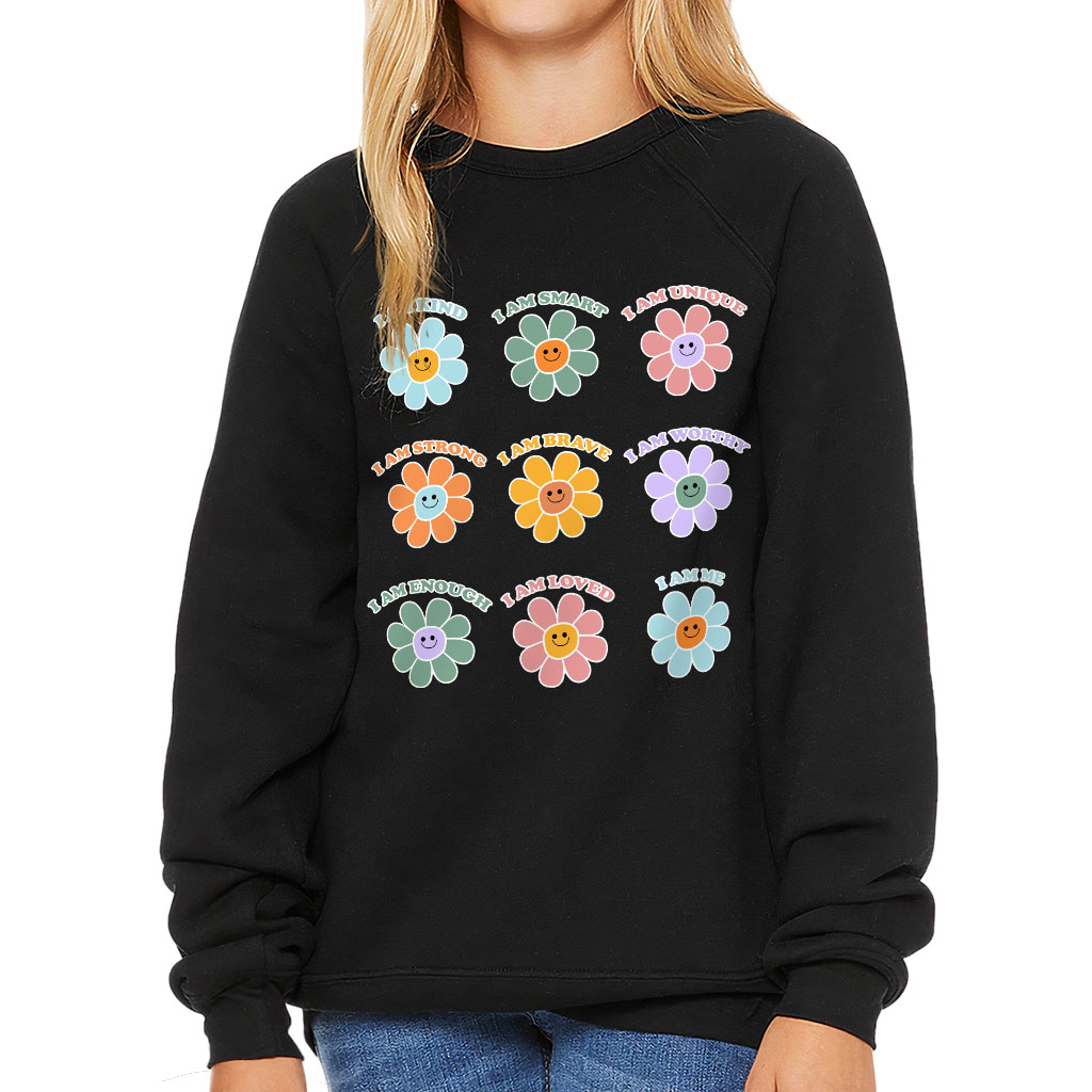 This remarkably soft pullover crewneck sweatshirt lends itself to daily wear and year-round layering. Positive Affirmations Kids’ Raglan Sweatshirt features ribbed cuffs and a waistband, a crew neck, and a fashion-forward fleece fabrication.